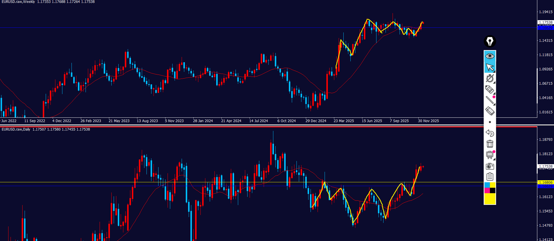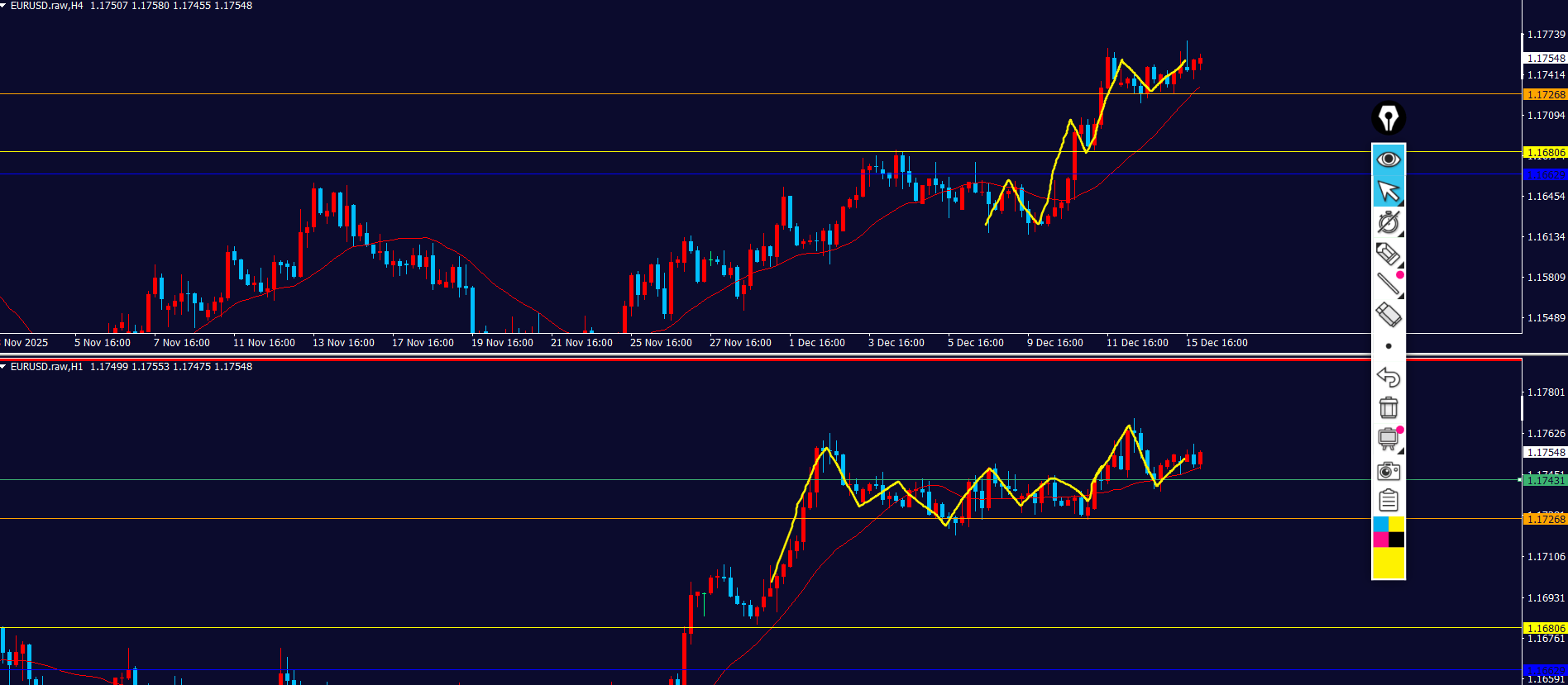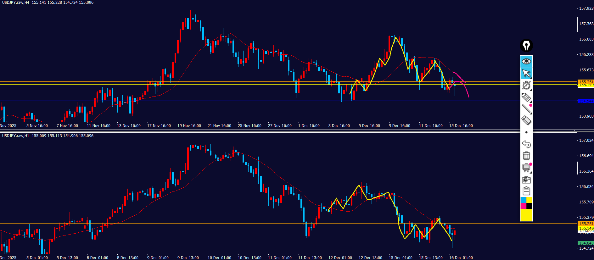 4hの環境認識の通り、積極的に狙う局面ではないと思うので、ダウカウントやMAととローソクの位置などよほどきれいでないと、エントリーしない。