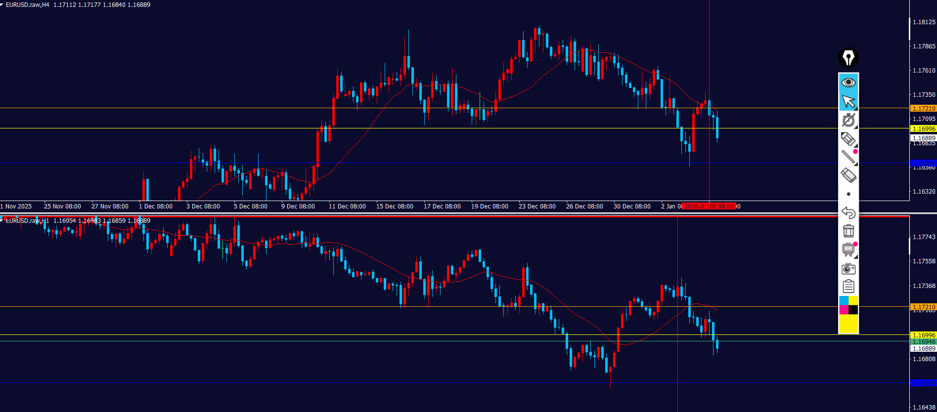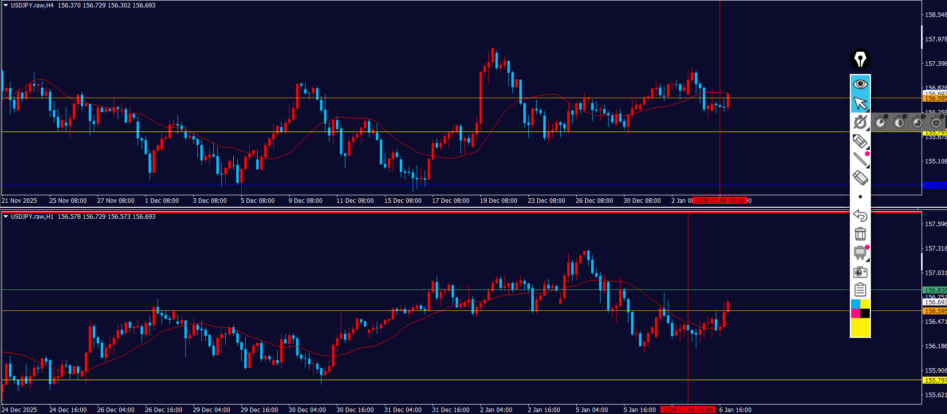 4hの水平線が2つ見えてるけど今はどちらが正解か判断がつかない。