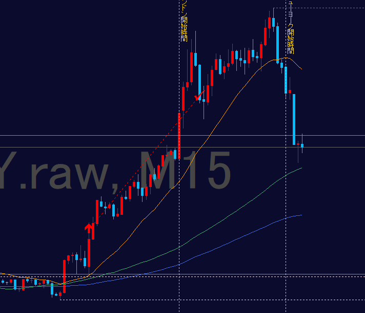 - 15分足でよこよこが続いていたので、明確なトレンド転換を下上矢印のところでエントリーした。