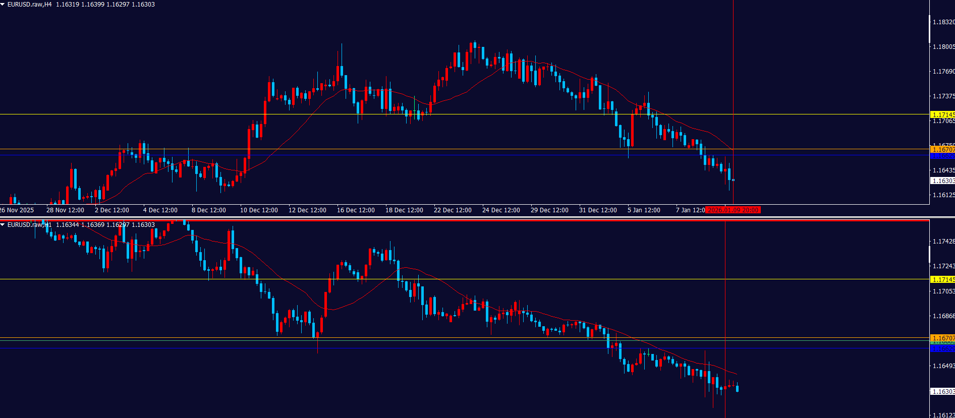 日足の買いと4hの売りが戦争状態のところのせいか、直近の1h足のローソク足がごちゃごちゃしてる。