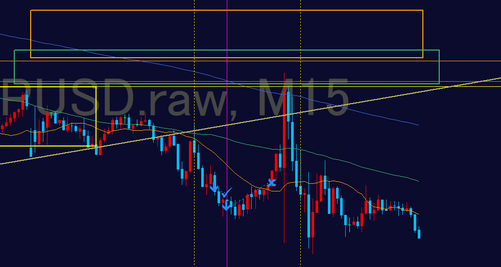 - 15分足に落とした際に、レジサポ転換して再度安値を抜けたあたりでエントリーした