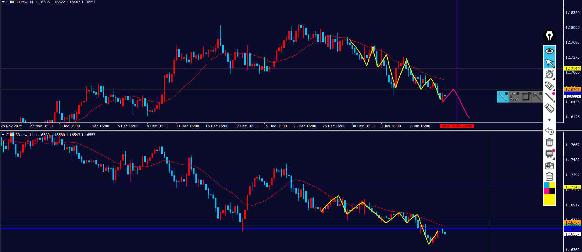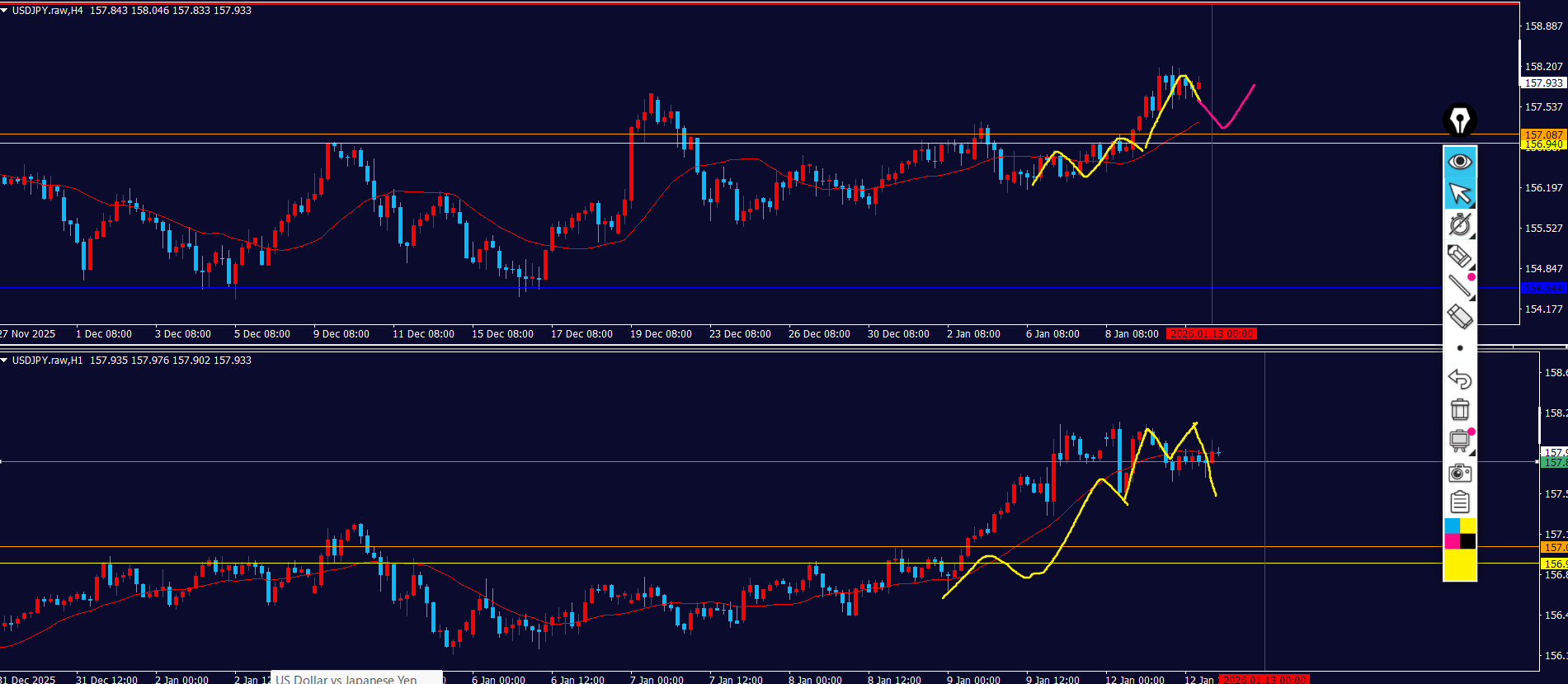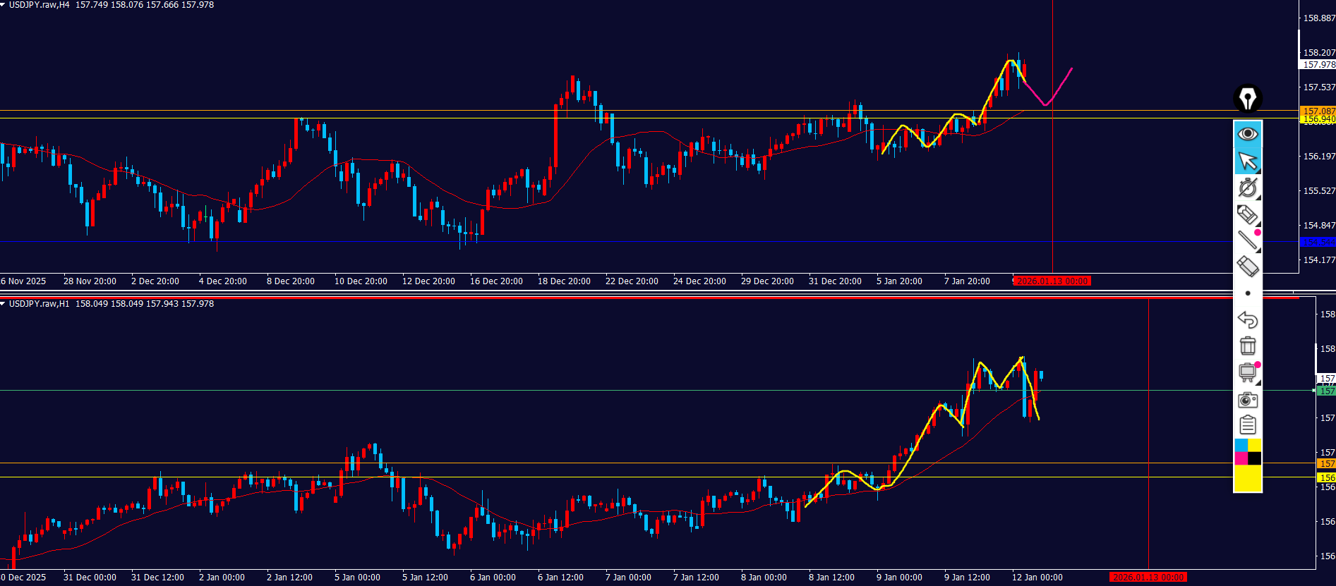 日足の買いと4hの売りが戦争状態のところのせいか、直近の1h足のローソク足がごちゃごちゃしてる。