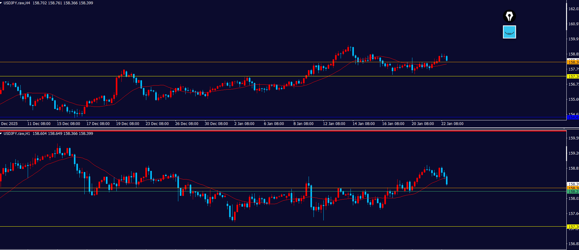 4h押し目買い狙えそうだけど、直近ローソク足に急な上下の値動きがあり、嫌な感じがする。