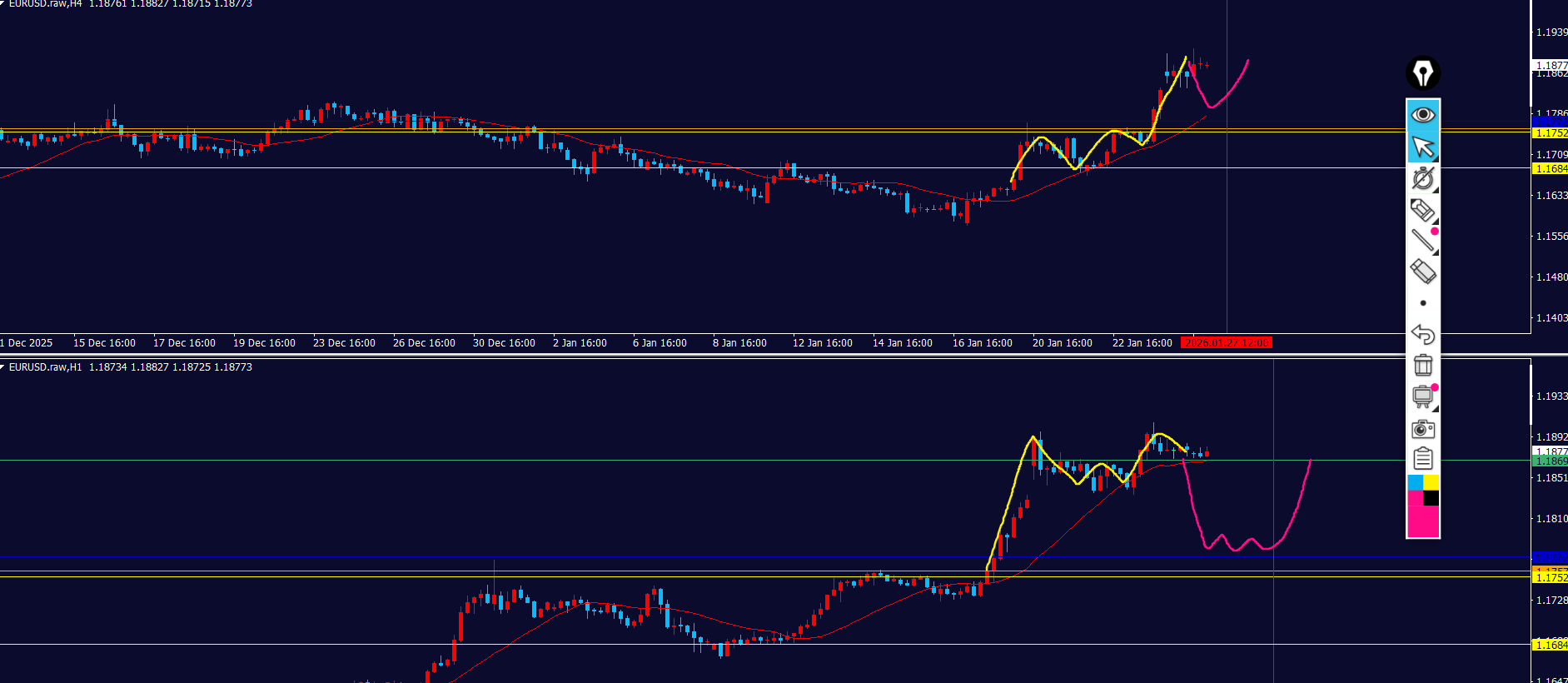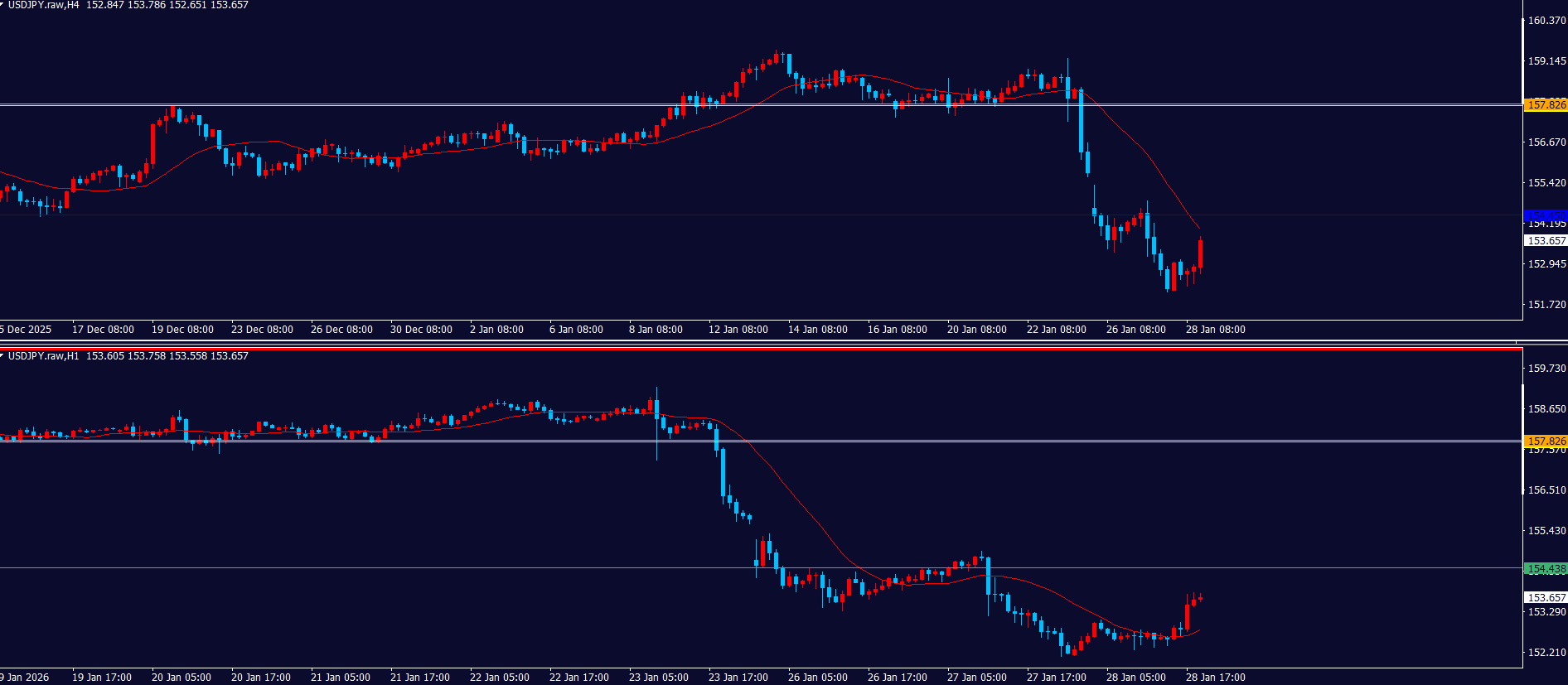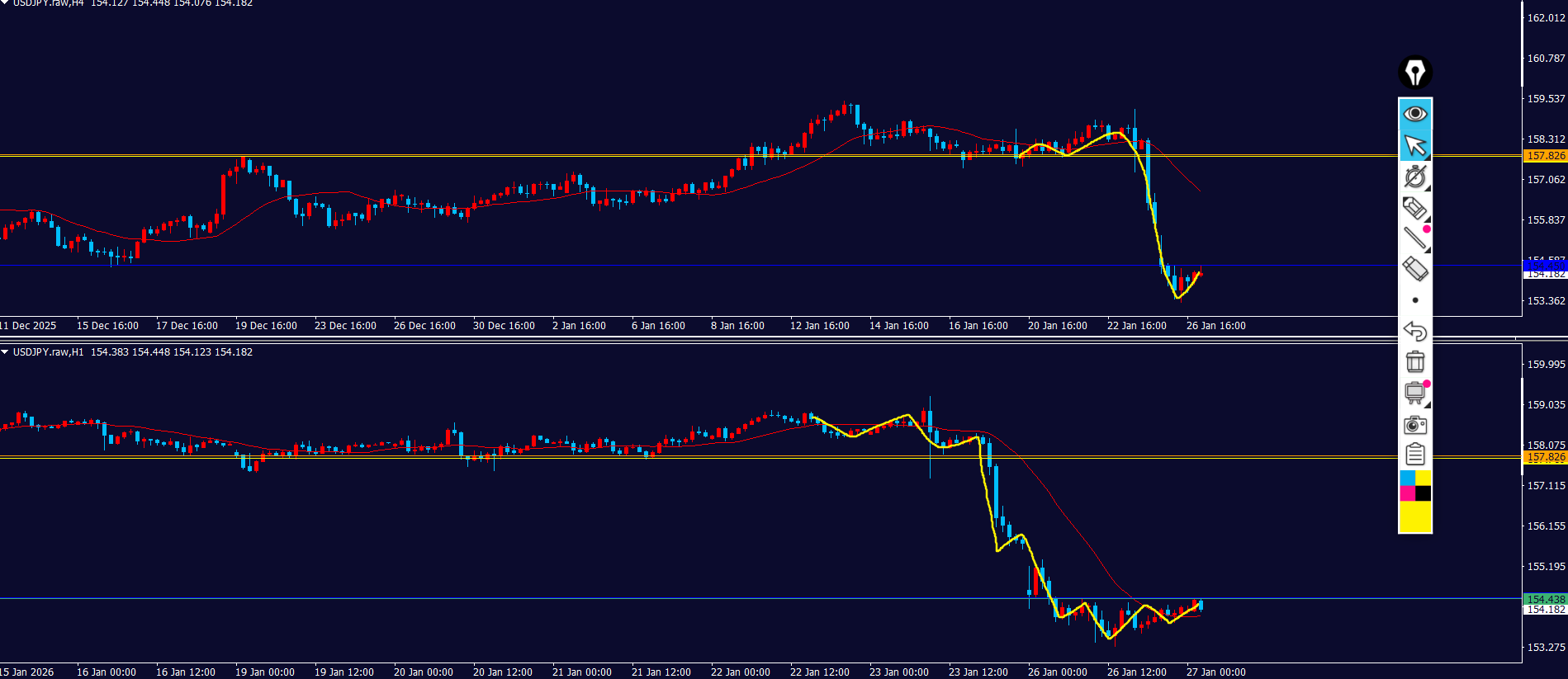 ユーロドルと同じ。1hで図示したような動きになればよいが、そうなったときに4hのMAはおそらくローソク足の上にいると思われるので、狙える状況か冷静に判断する。