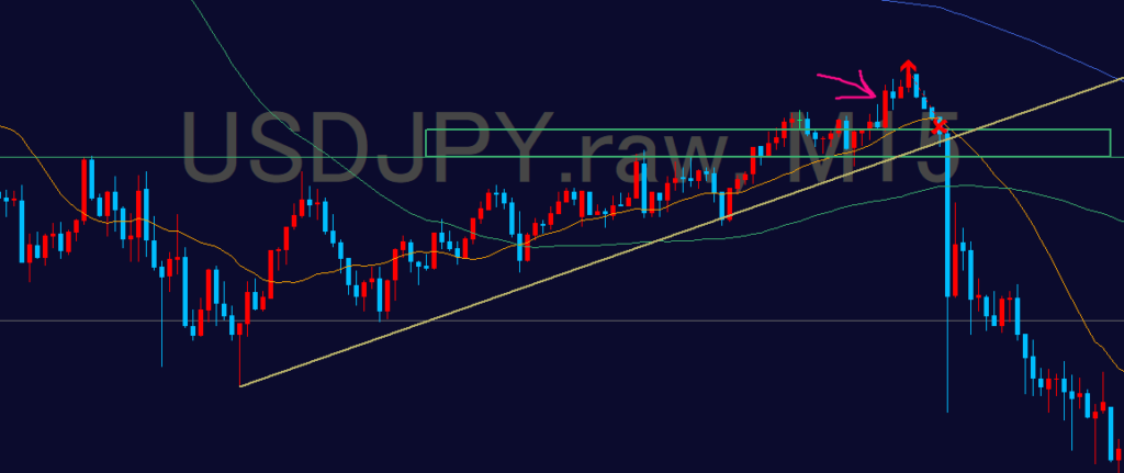 急降下してるので動き怪しい。この動きで戻り売りを狙うことはしない(戻したら戻したで、かなり買いの勢いが強いと思われるので)