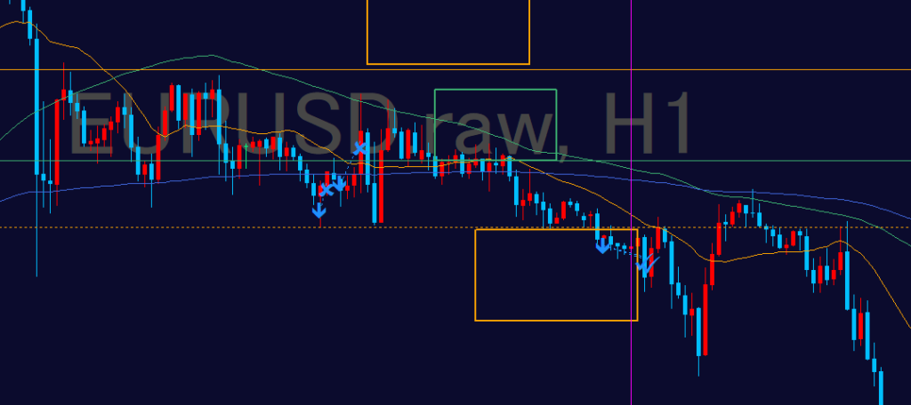 - 一方で1hを見ると、注文の集中からの1波ブレイクを狙ってリスク覚悟でエントリーするというのはありだったと思う