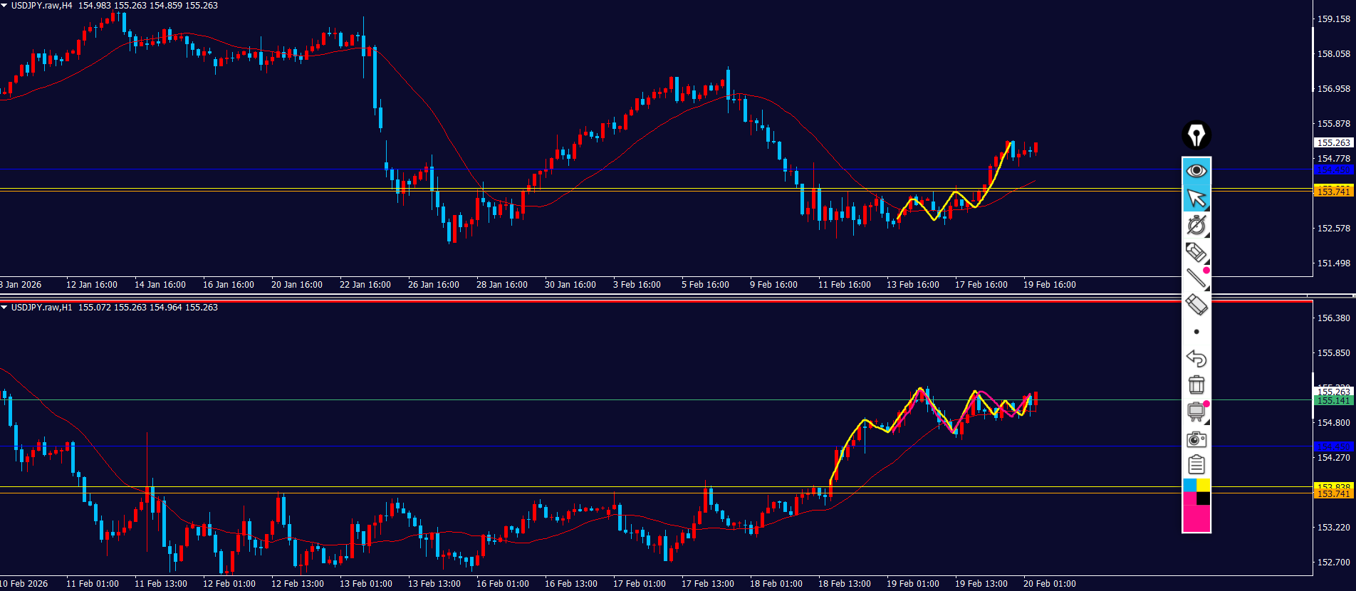 見えている状況としては、4h調整⇒1h押し目買い⇒4h上昇トレンド継続のシナリオ。