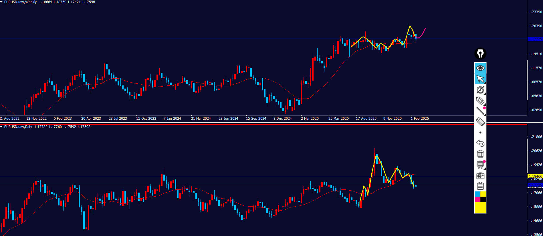けど週足でダウカウント引いた場合、今日波出たとしたらかなり急で不自然な波になってしまうので、まだ週足の押し目買いは入らないと見ている。