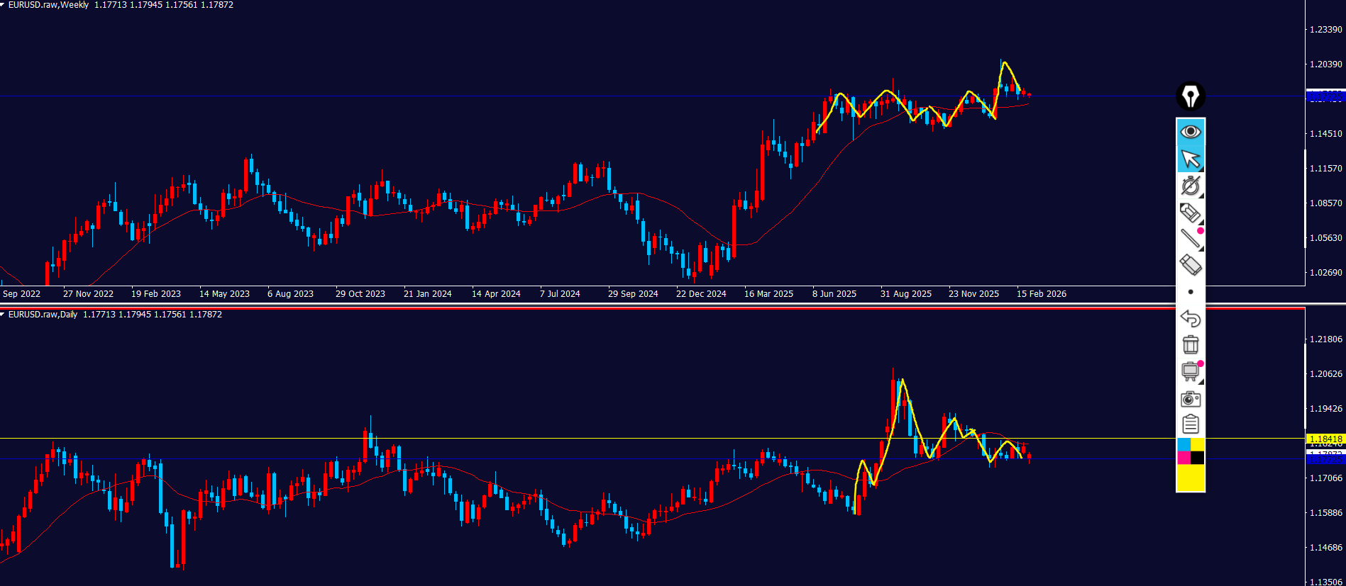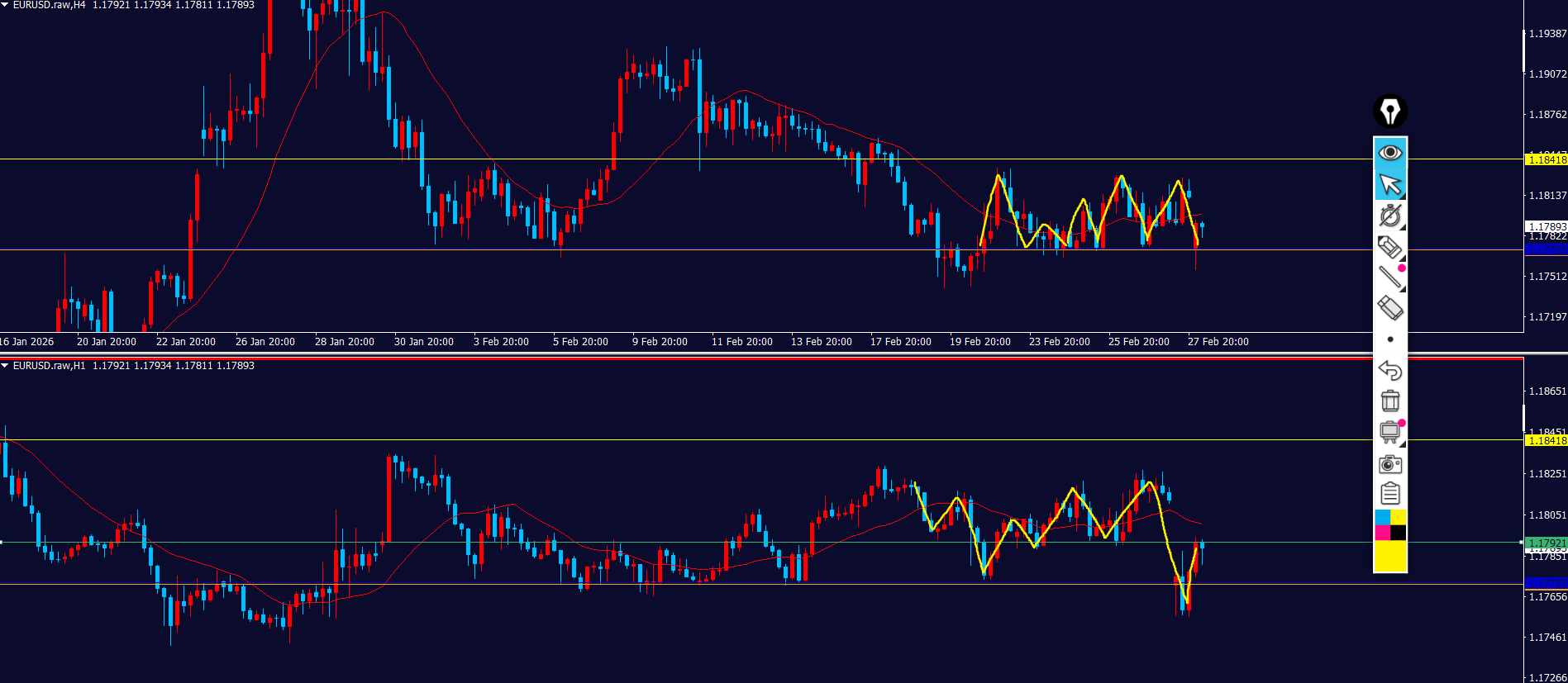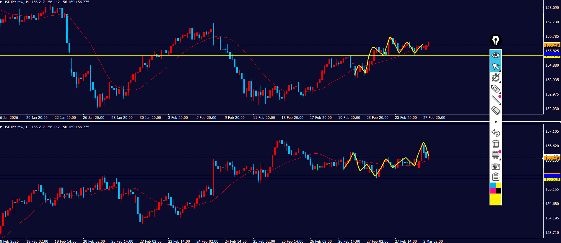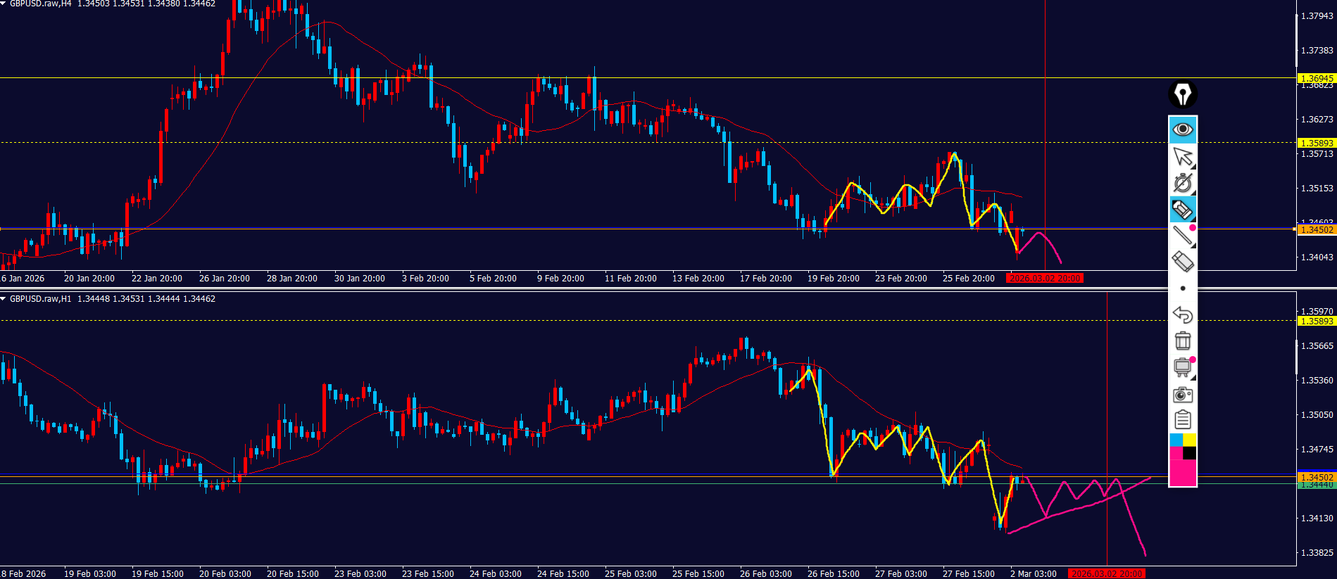 - 売り抑えラインとして黄色点線も見えてる⇒ピンクのダウカウントで見ると戻り売りの波の途中