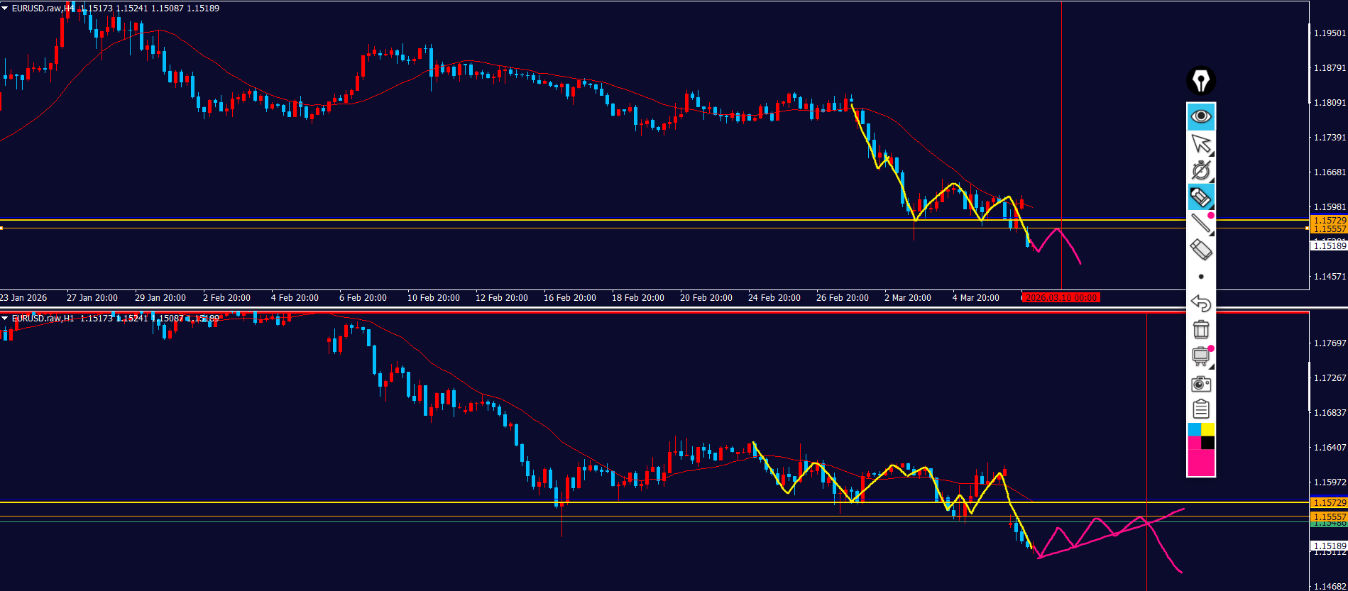 - 1h:下降トレンド転換⇒下方向強