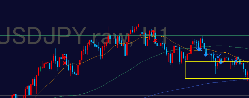 - 振り返りが遅く、1hと15分足の水平線が変わっちゃってるので、振り返りにくい。