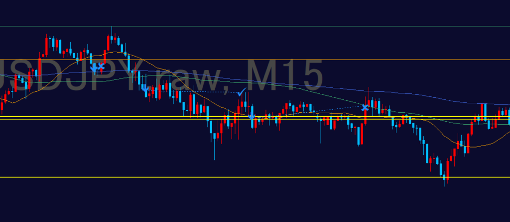 - 15分足や1時間足のローソク足が確定するまで待つ