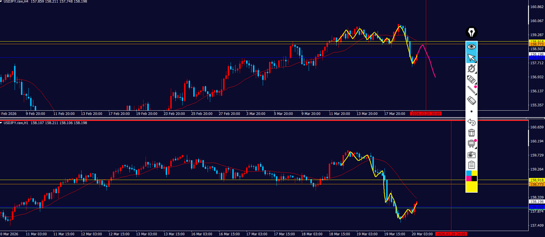1hも同じ状況で、早い波が出るのかしっかり4hの時間経過を待つのか見極める