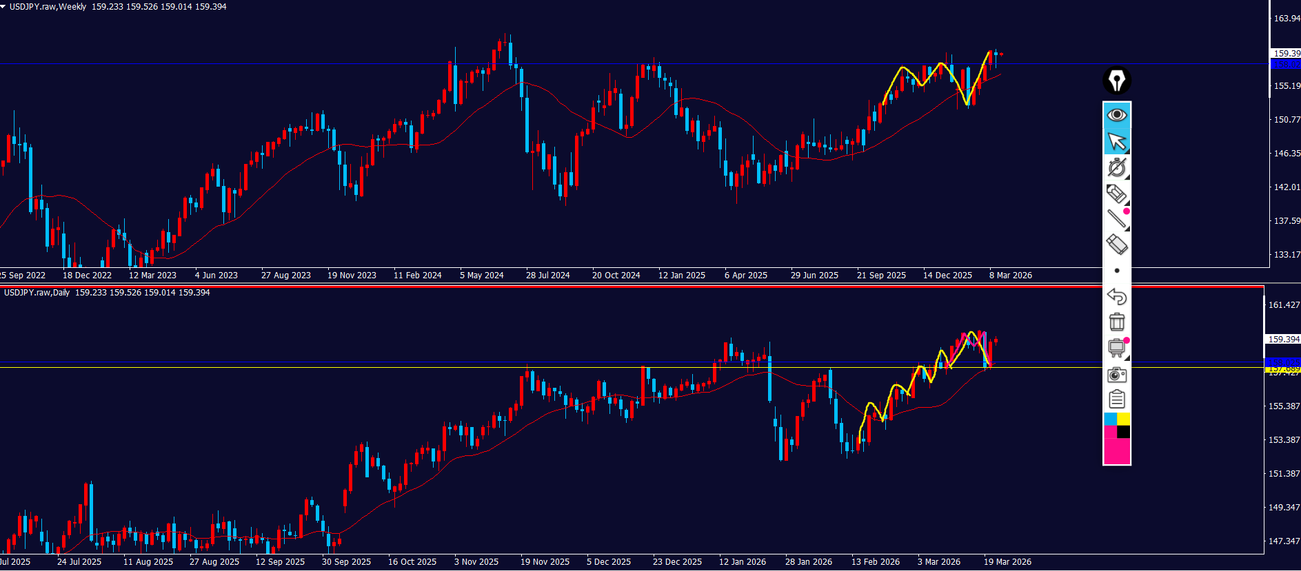 - 黄色ラインの下に押し目買い勢力がいる⇒波が出やすい