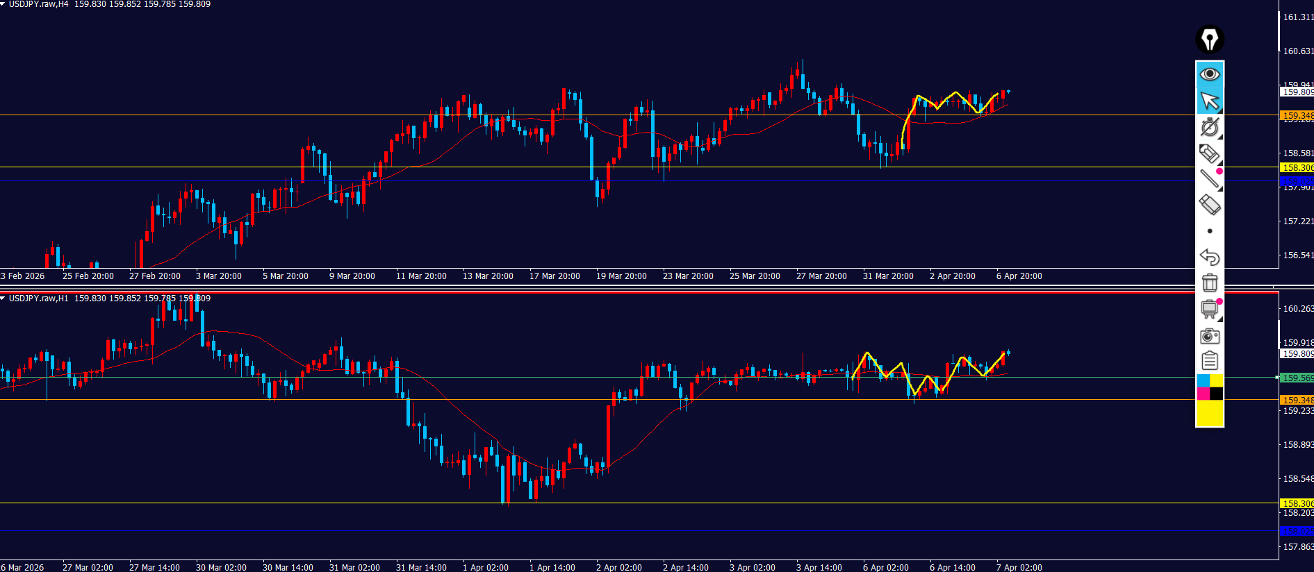 少し攻めるなら、1hは上昇トレンド形成してきたので、4h1波狙いで上方向にエントリーするか。