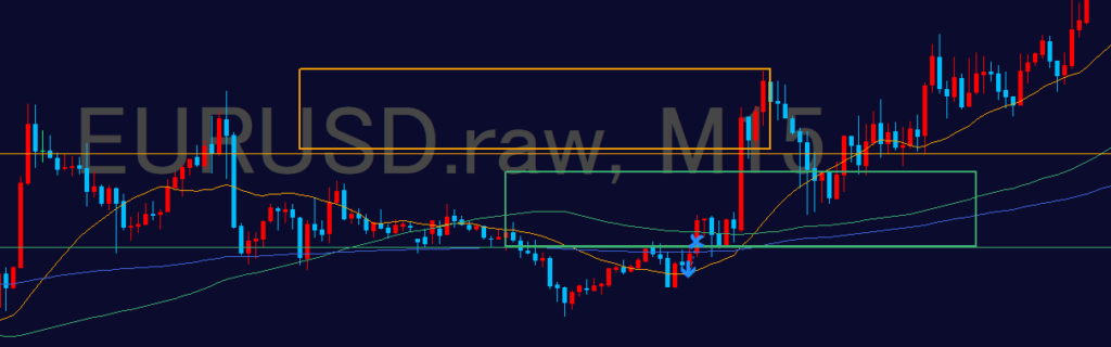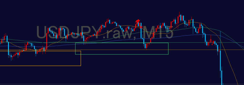 - 15分足で上昇トレンドの注文の集中を抜けたところでエントリー