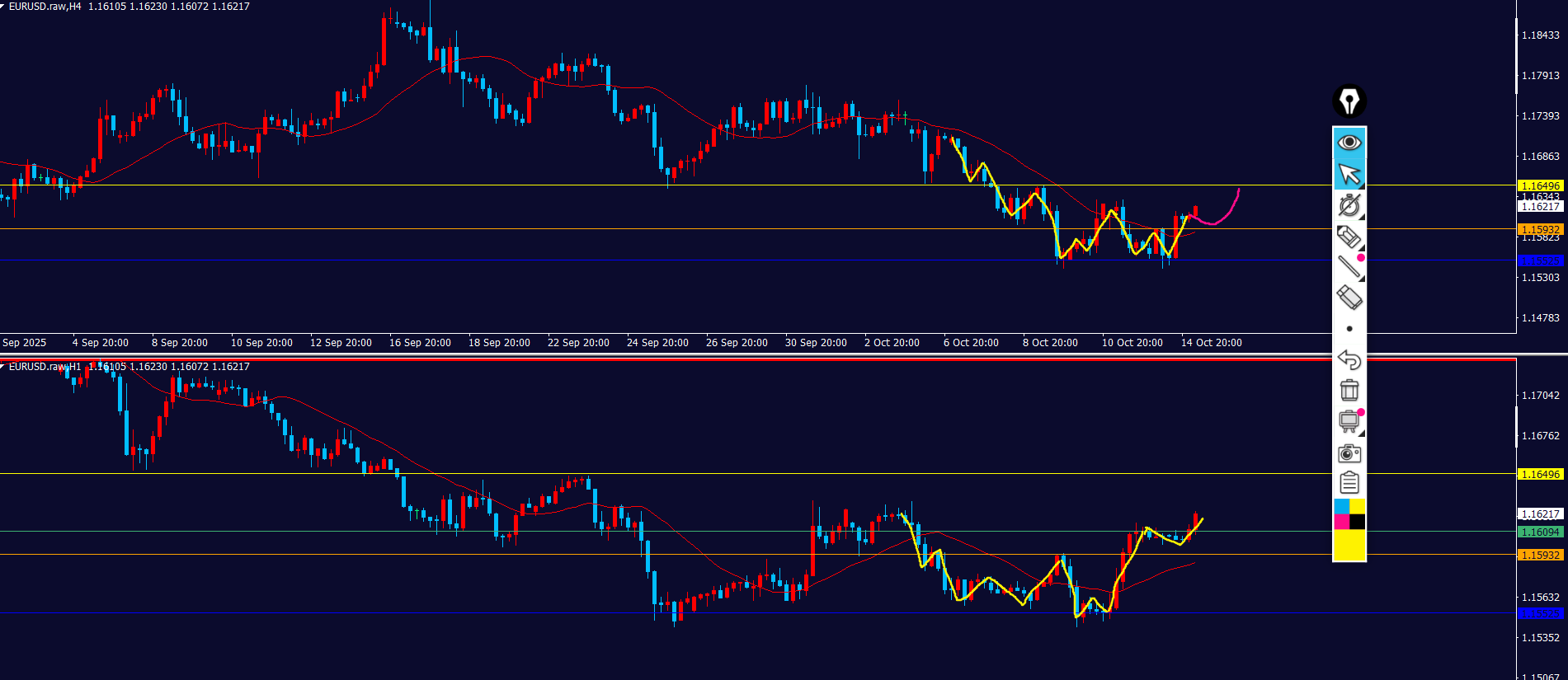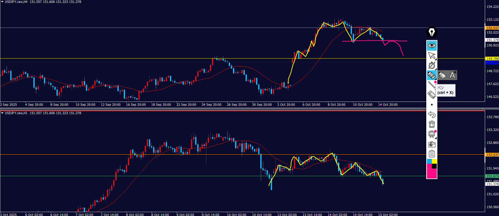 1HのMAが少し横向きになってきたので、若干勢いは落ちてきたかも(ちょうど止められやすい位置にいる)。