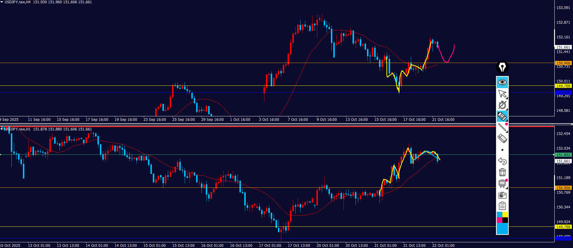 - 「4時間」の波が止まって押し目買い(戻り売り)エリアで入る