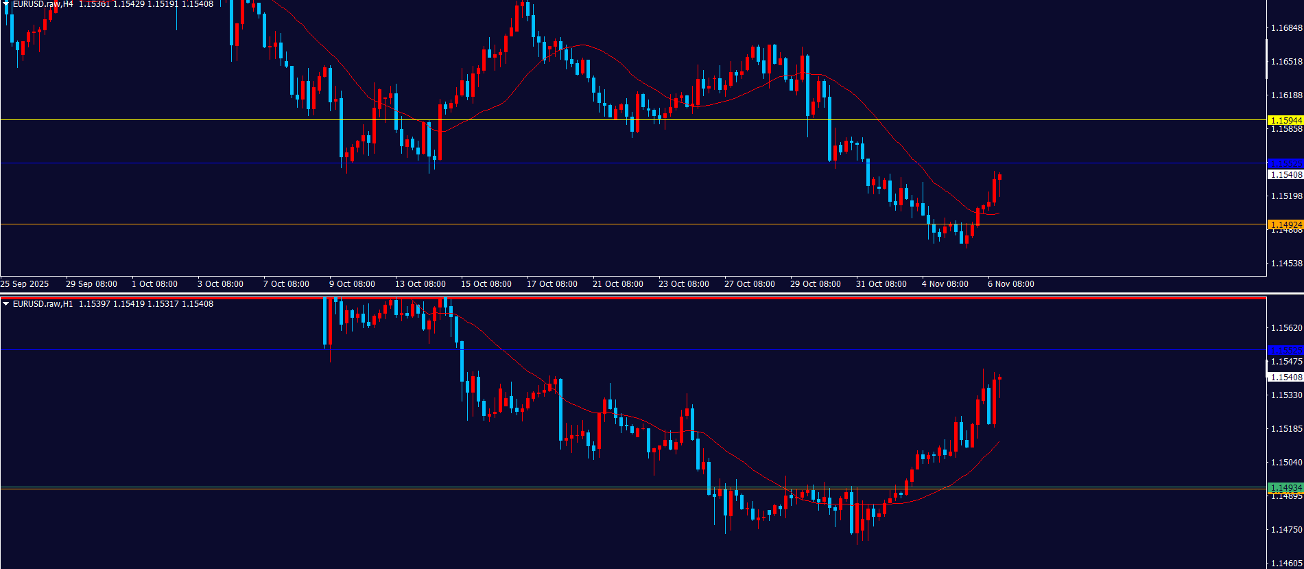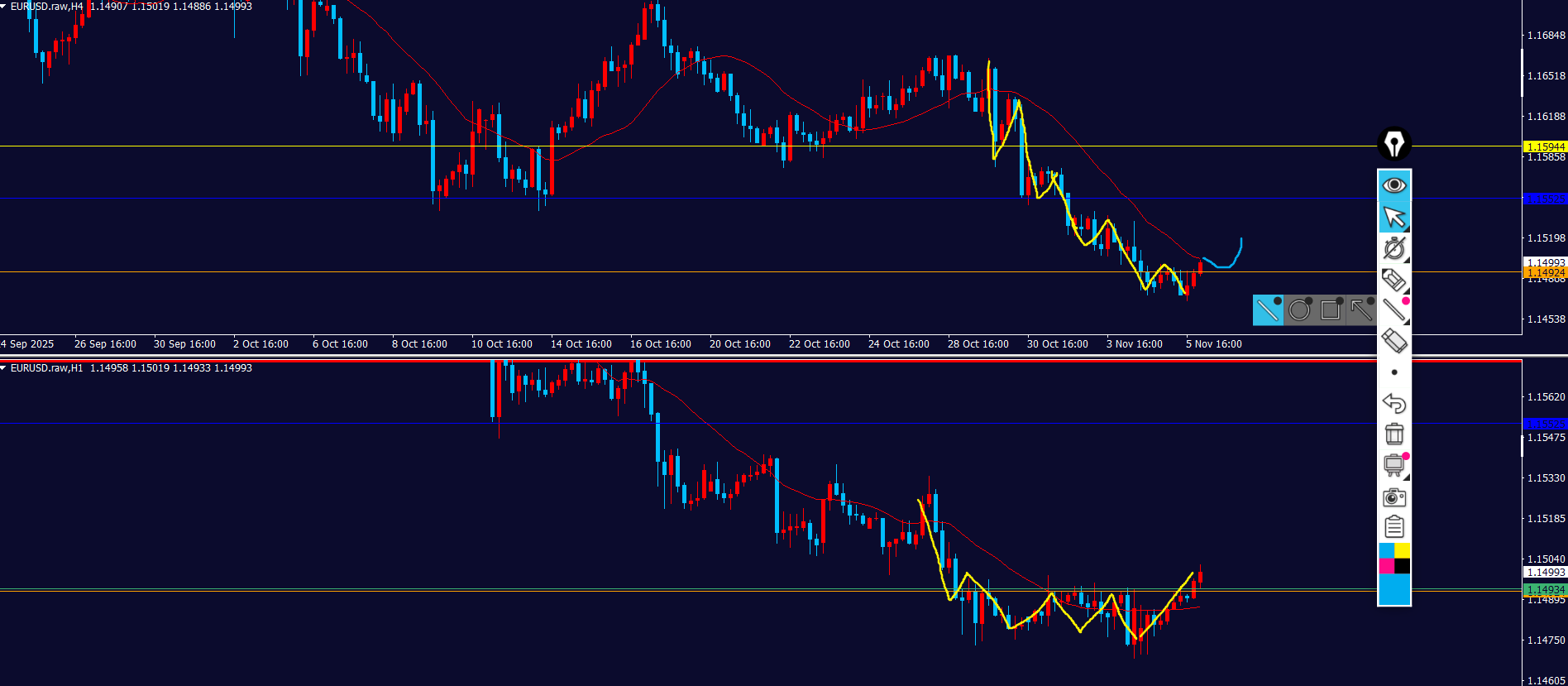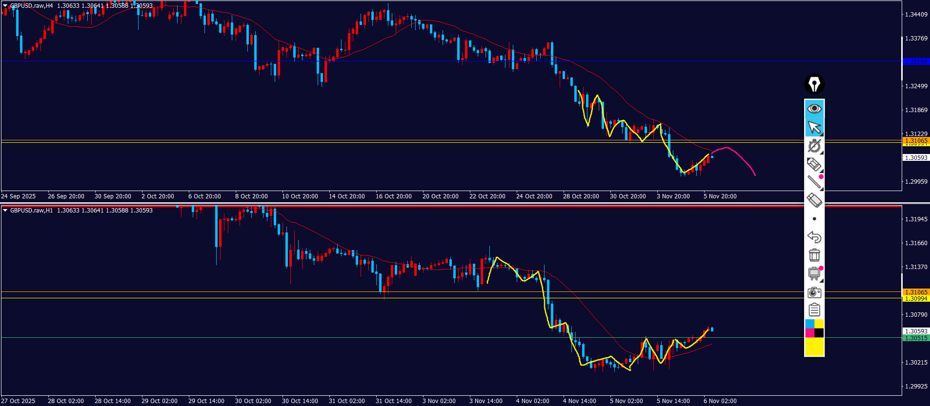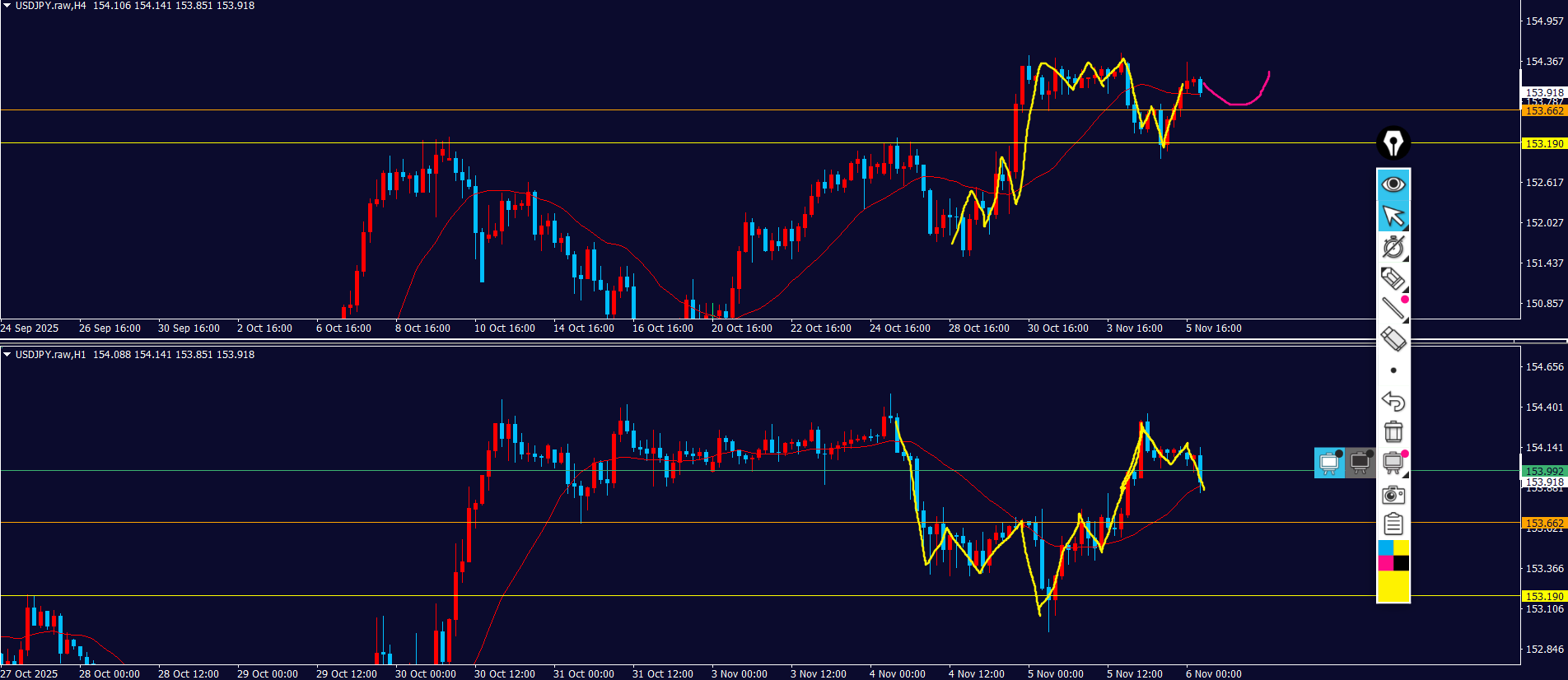 4hが確定した際のローソク足次第だけど、1hでは上昇転換し始めに見えるので、自分は上方向で見ている(青い波が出ると見てる)