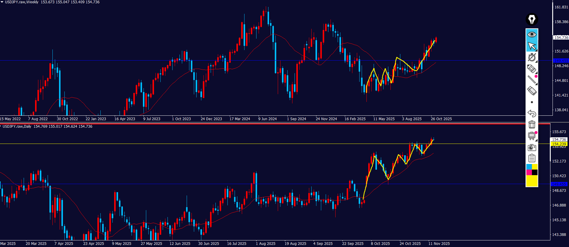 かなり上昇してきてるけど、週足も日足も上方向に伸びてるので、「そろそろ止まりそう」という感覚はいったんはじに寄せて、環境認識的に見て上方向という事実を頭に入れておく。