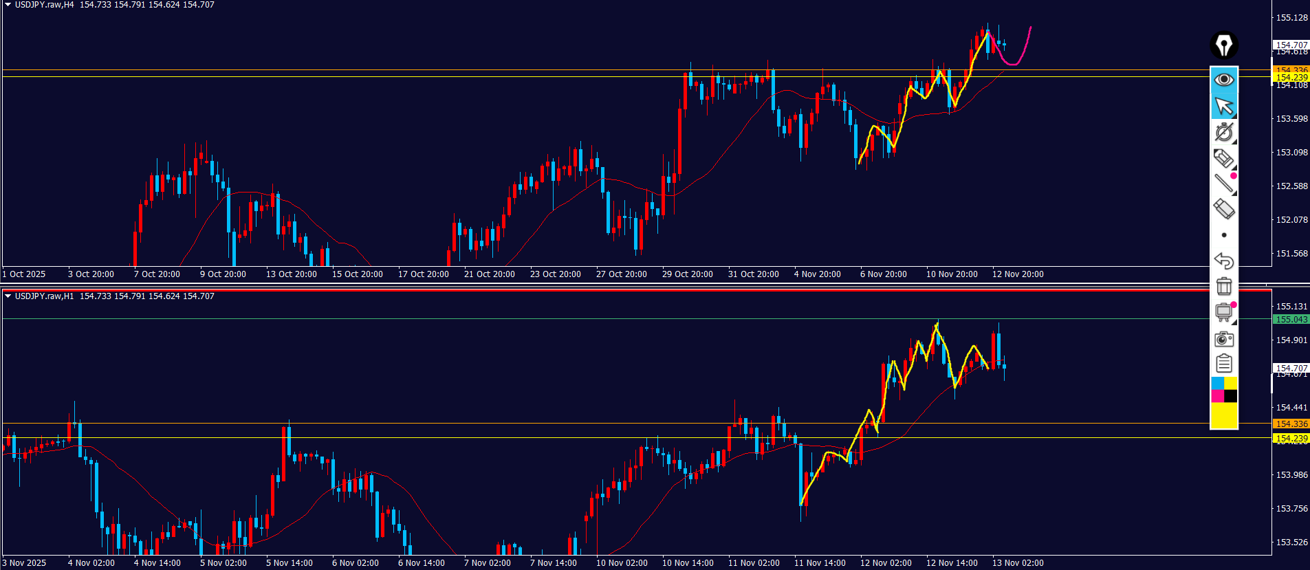 - 「4時間」の波が止まって押し目買い(戻り売り)エリアで入る