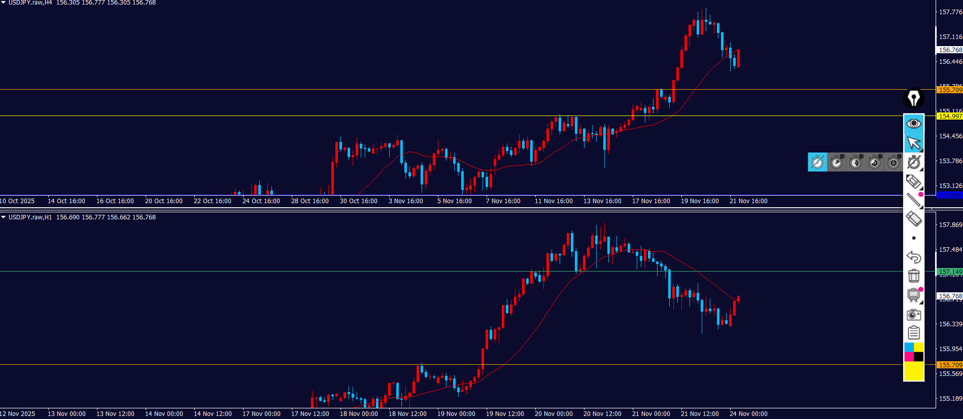 - 斜めのラインが攻防抜けといえるかもしれないけど、4hの水平線からは自分は離れすぎと見てしまう位置なので、どちらにしろとれない波だった。
