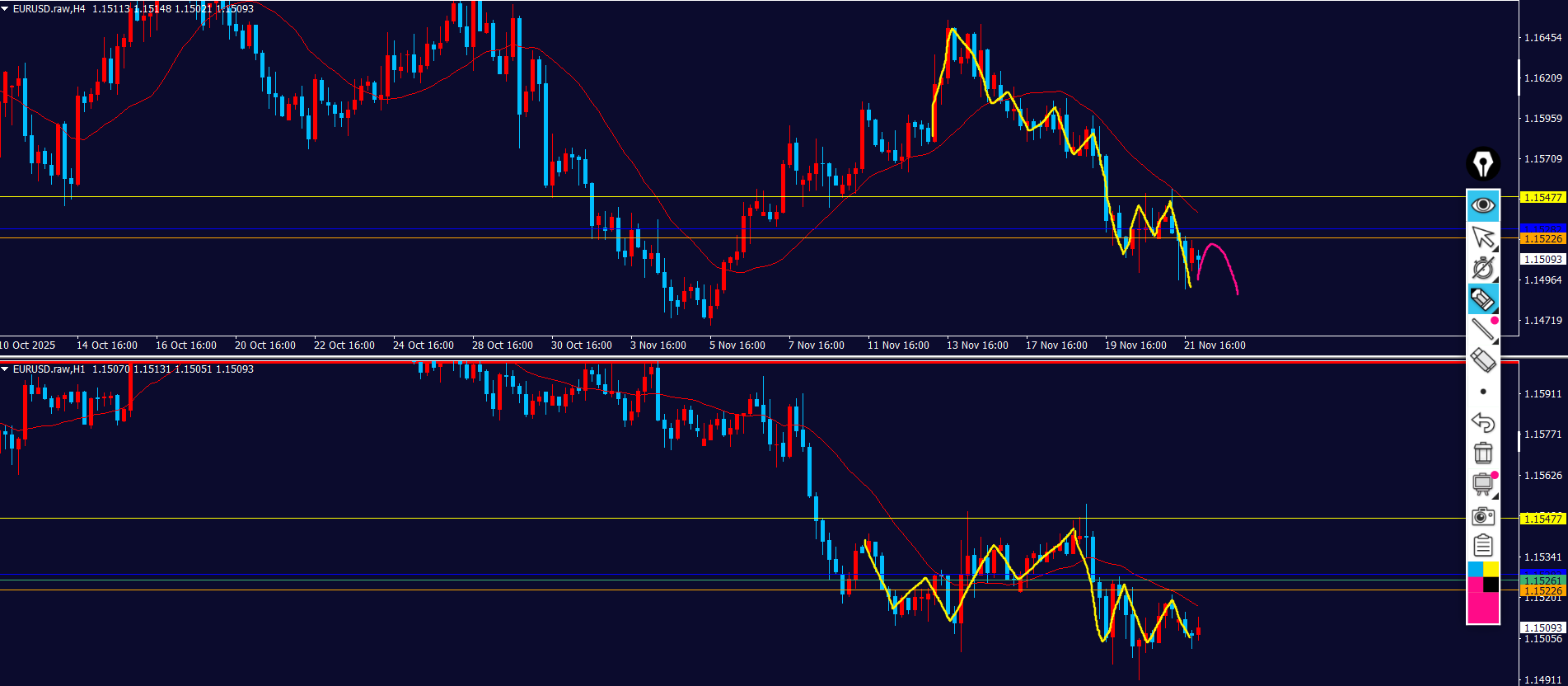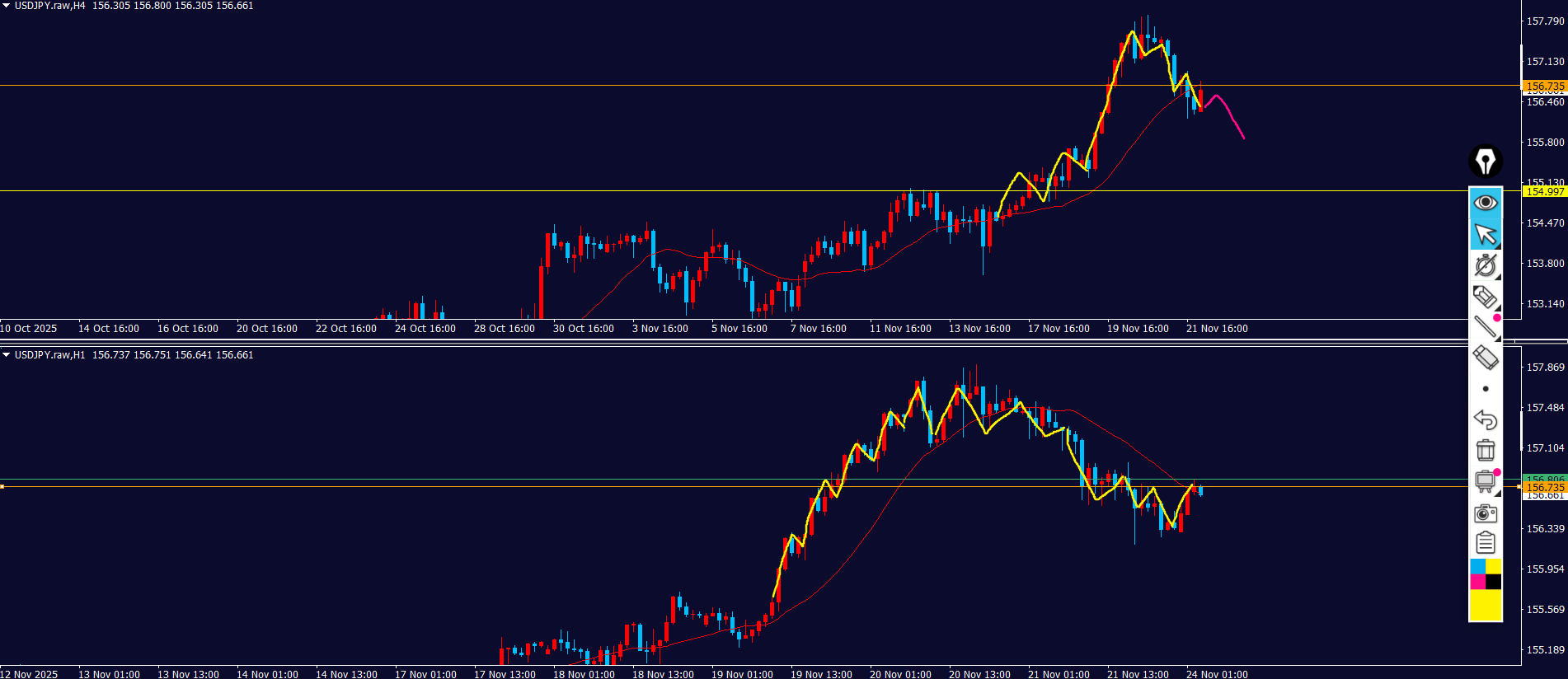 - 「4時間」の波が止まって押し目買い(戻り売り)エリアで入る