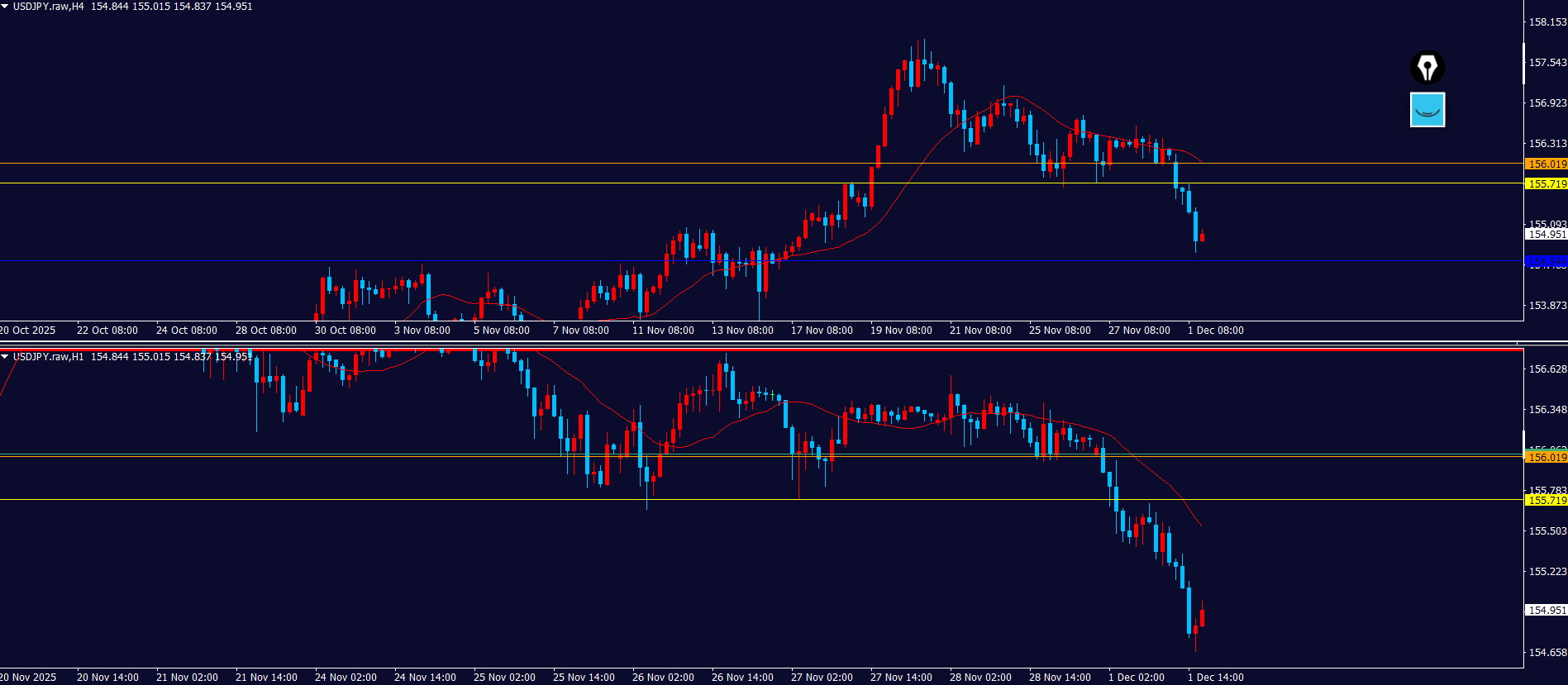 4hと1hが同時に抜けてるので、攻防ライン抜けでのエントリーになるかも?(トレード日誌で答え合わせ)